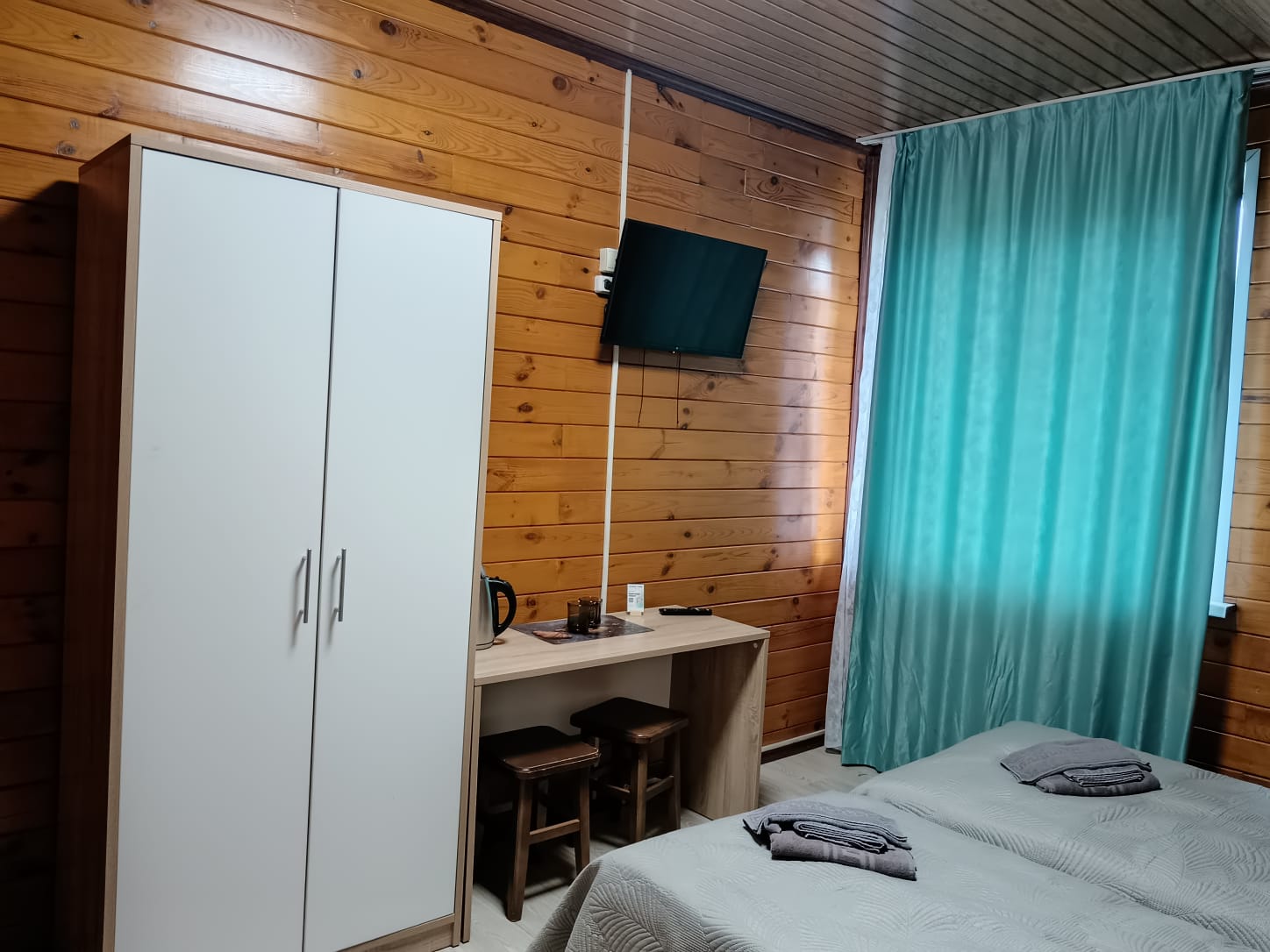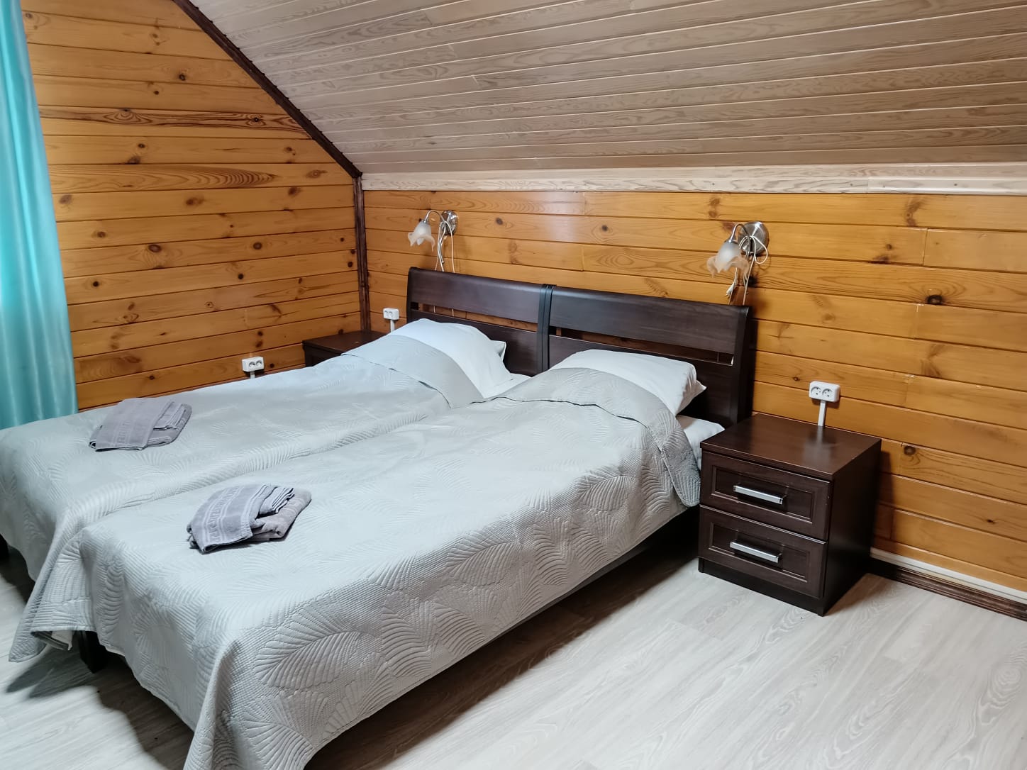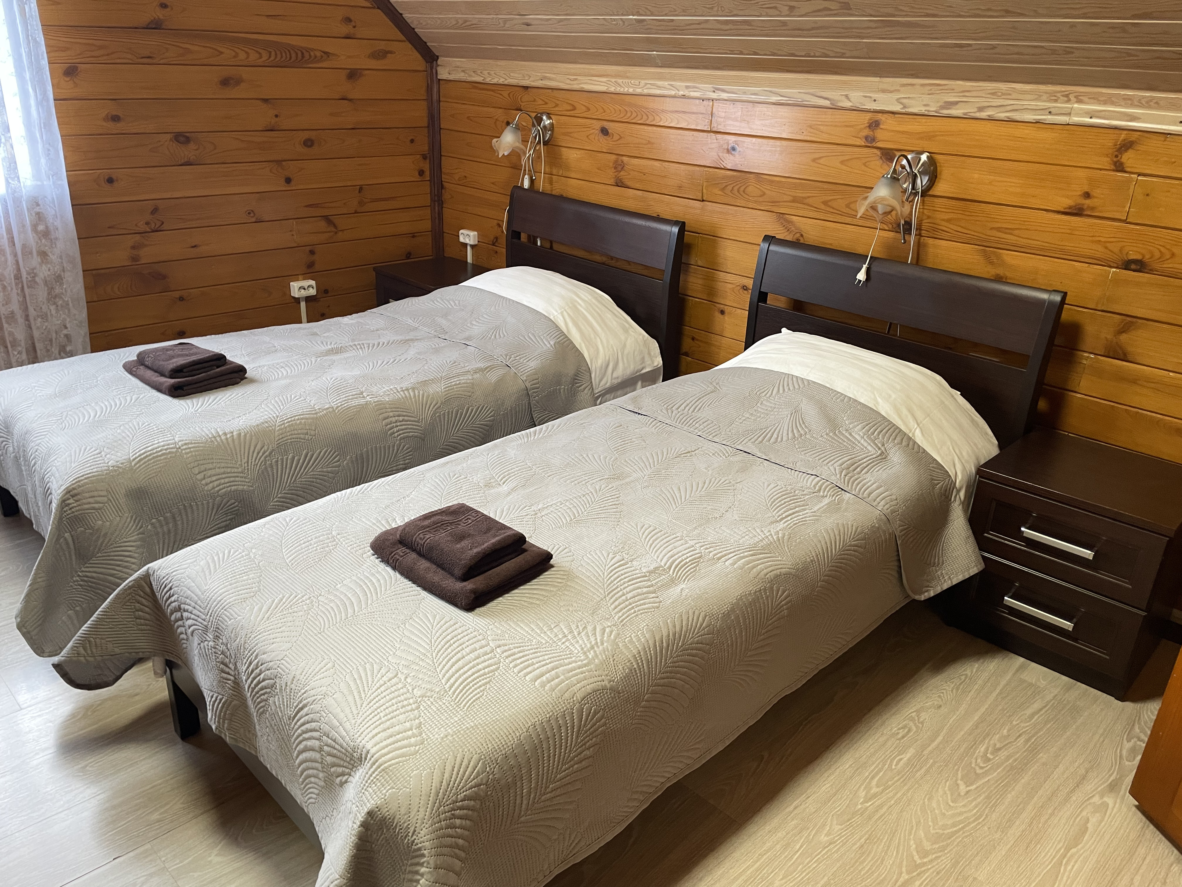 2-ой этаж, натуральное дерево, 2-е односпальные кровати , 2-е тумбочки, столик, 2-а стула, прихожая, телевизор, чайник, кружки, фен, полотенца, санузел, общая площадь номера 16 кв.м