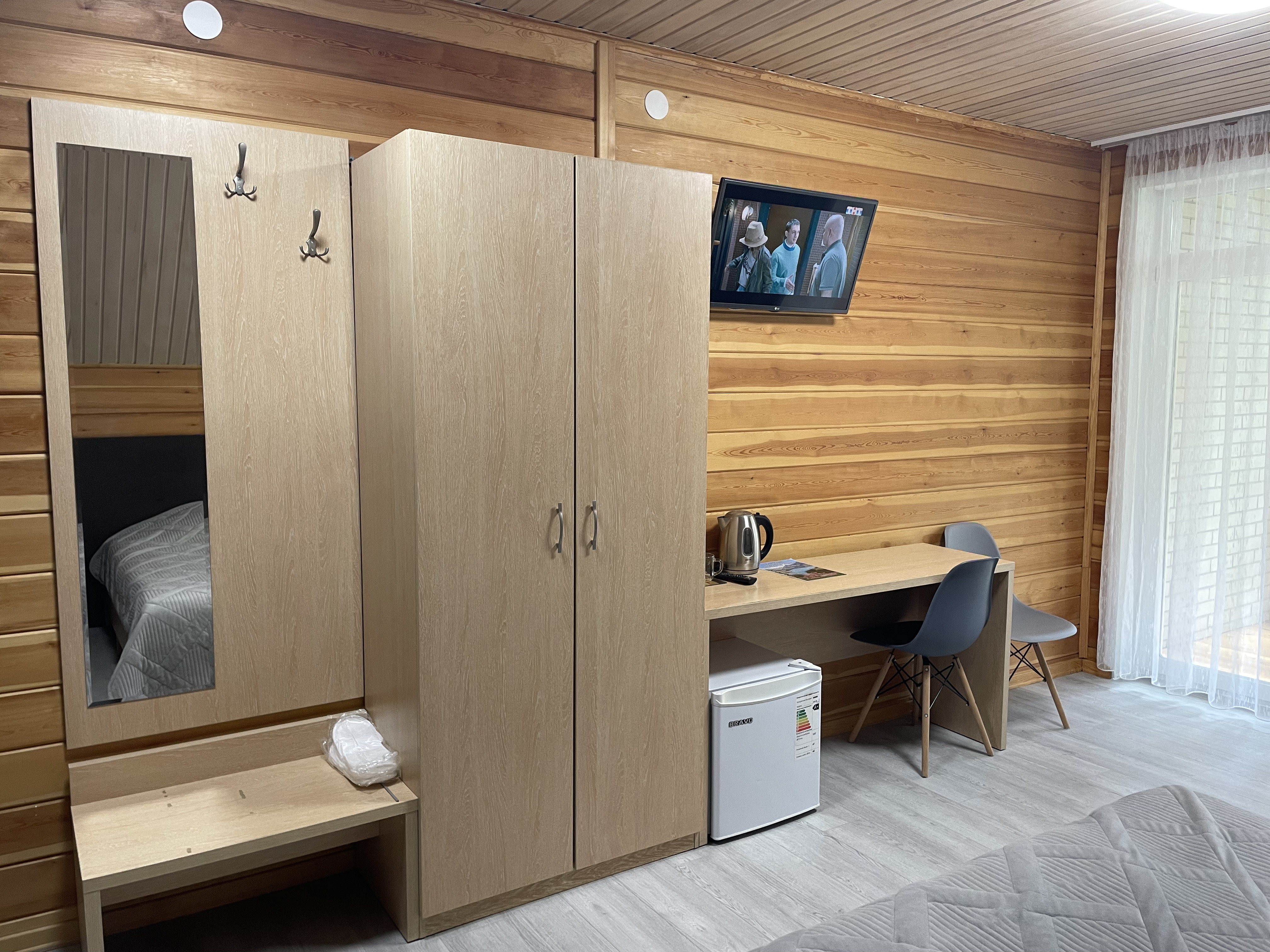 Номер расположен на втором этаже 2-х этажного коттеджа и имеет просторный балкон и свой отдельный вход. Внутренняя отделка выполнена из натурального дерева. В номере имеется 2-е односпальные кровати, раздвижной диван на два доп места, две тумбочки, стол, два стула, шифоньер, прихожая, чайник, кружки, телевизор, холодильник, кондиционер, санузел с душевой кабиной, фен, халаты, полотенца, туалетные принадлежности. Общая площадь номера 24 кв. м. (с балконом 30 кв.м.)
