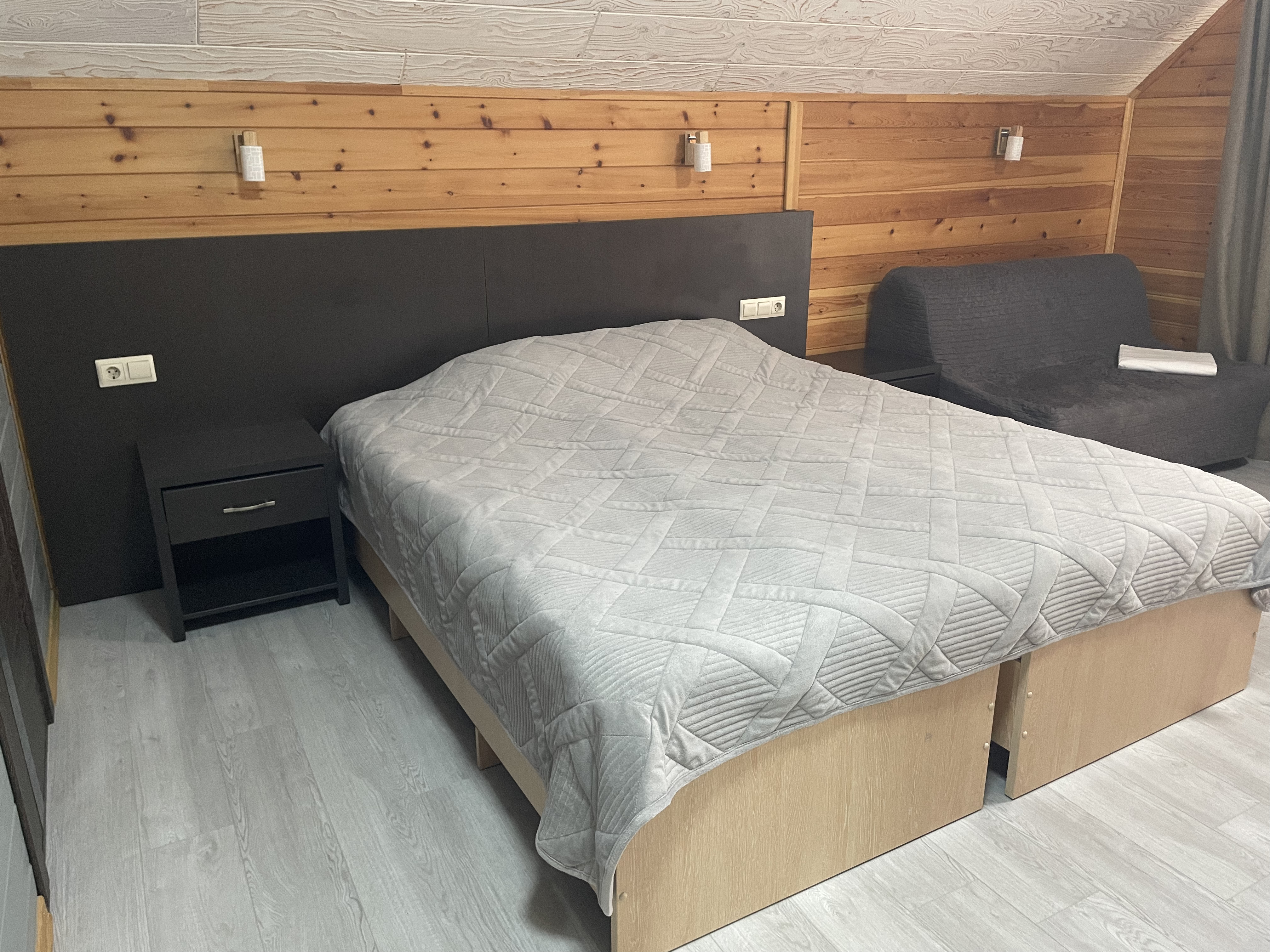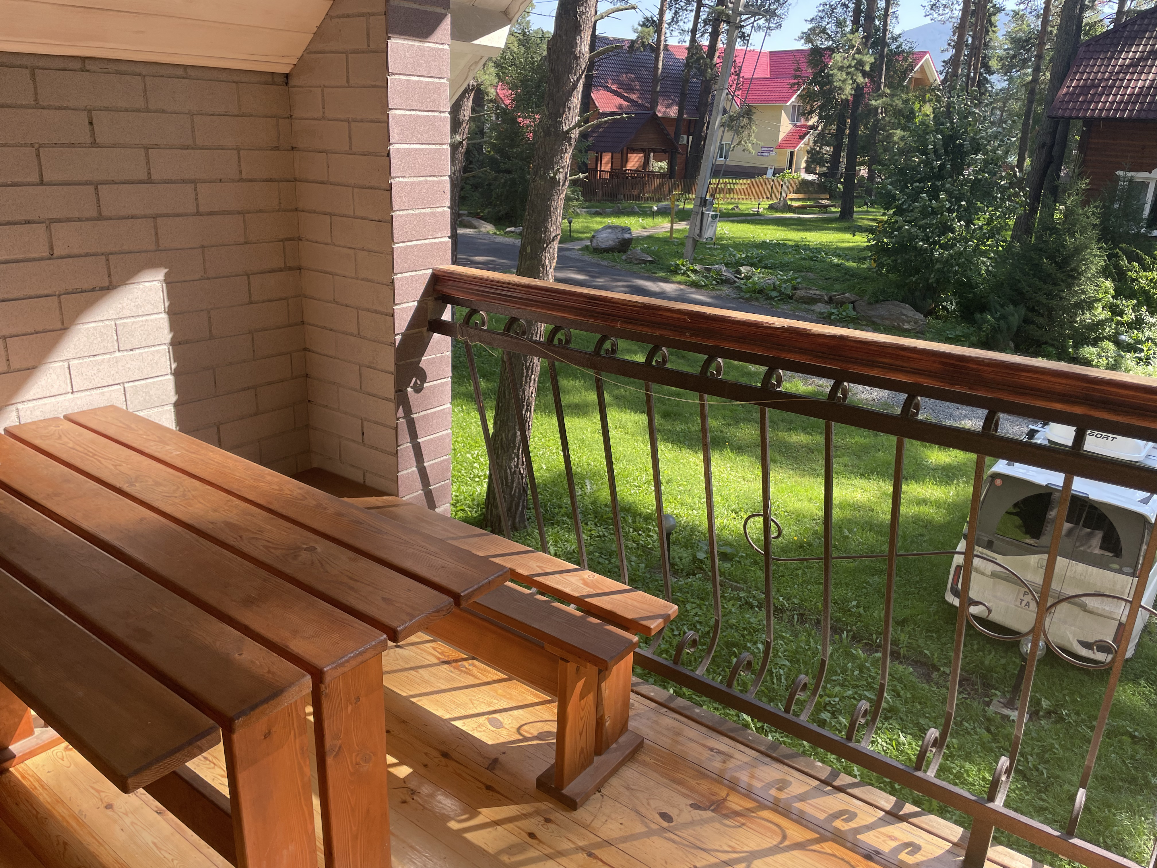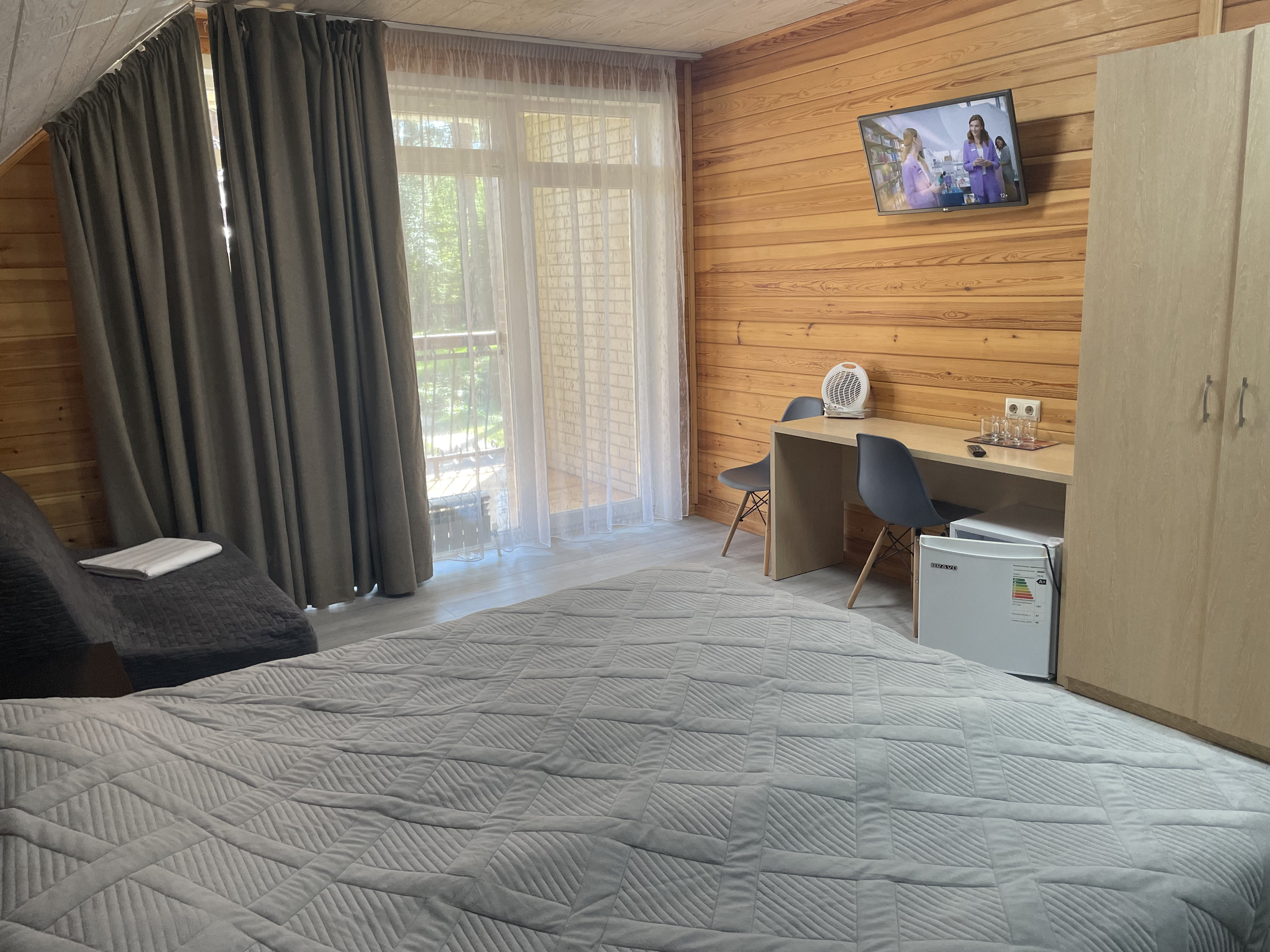 Номер расположен на втором этаже 2-х этажного коттеджа и имеет просторный балкон и свой отдельный вход. Внутренняя отделка выполнена из натурального дерева. В номере имеется 2-е односпальные кровати, раздвижной диван на два доп места, две тумбочки, стол, два стула, шифоньер, прихожая, чайник, кружки, телевизор, холодильник, санузел с душевой кабиной, фен, халаты, полотенца, туалетные принадлежности. Общая площадь номера 24 кв. м. (с балконом 30 кв.м.)