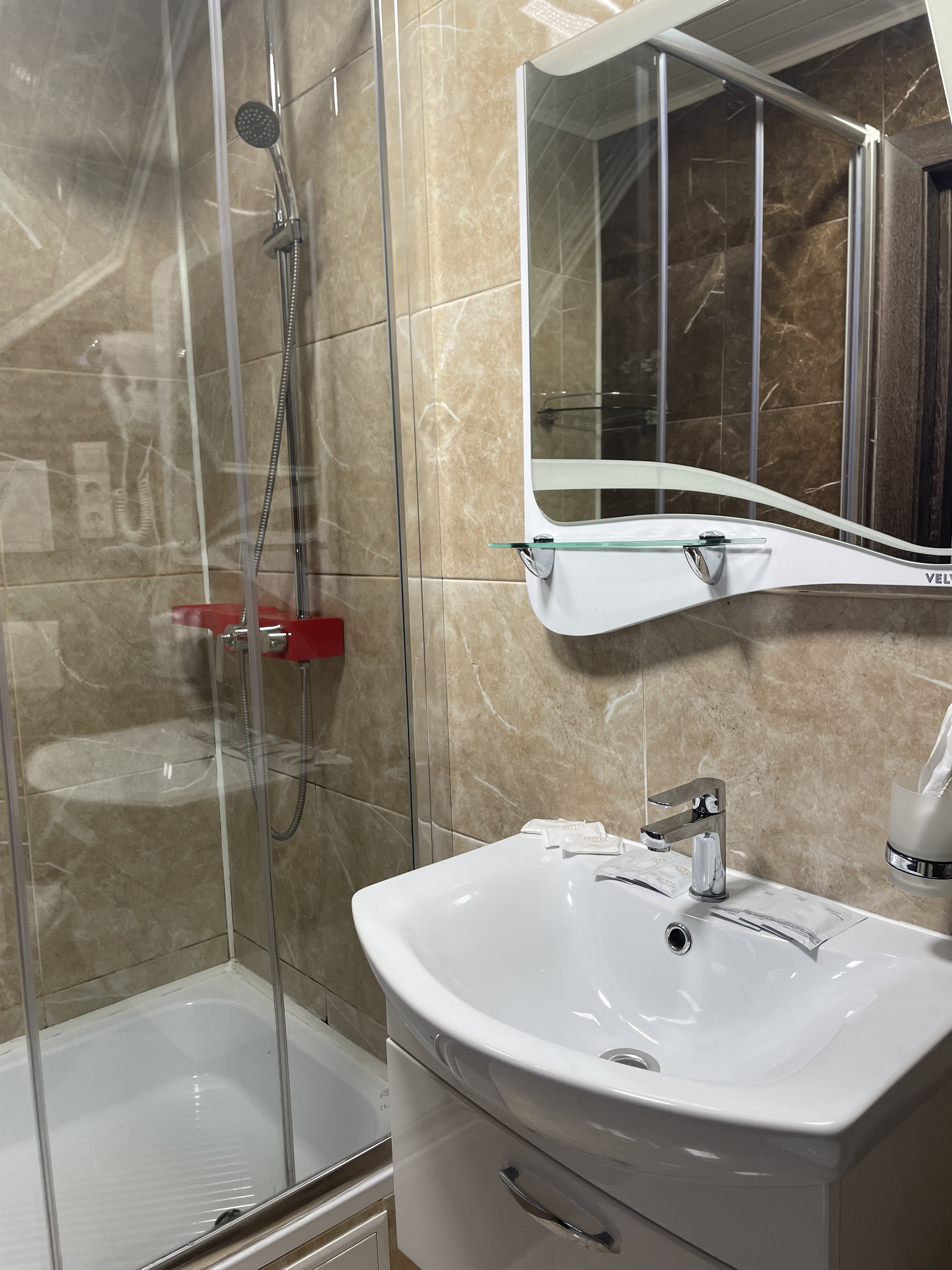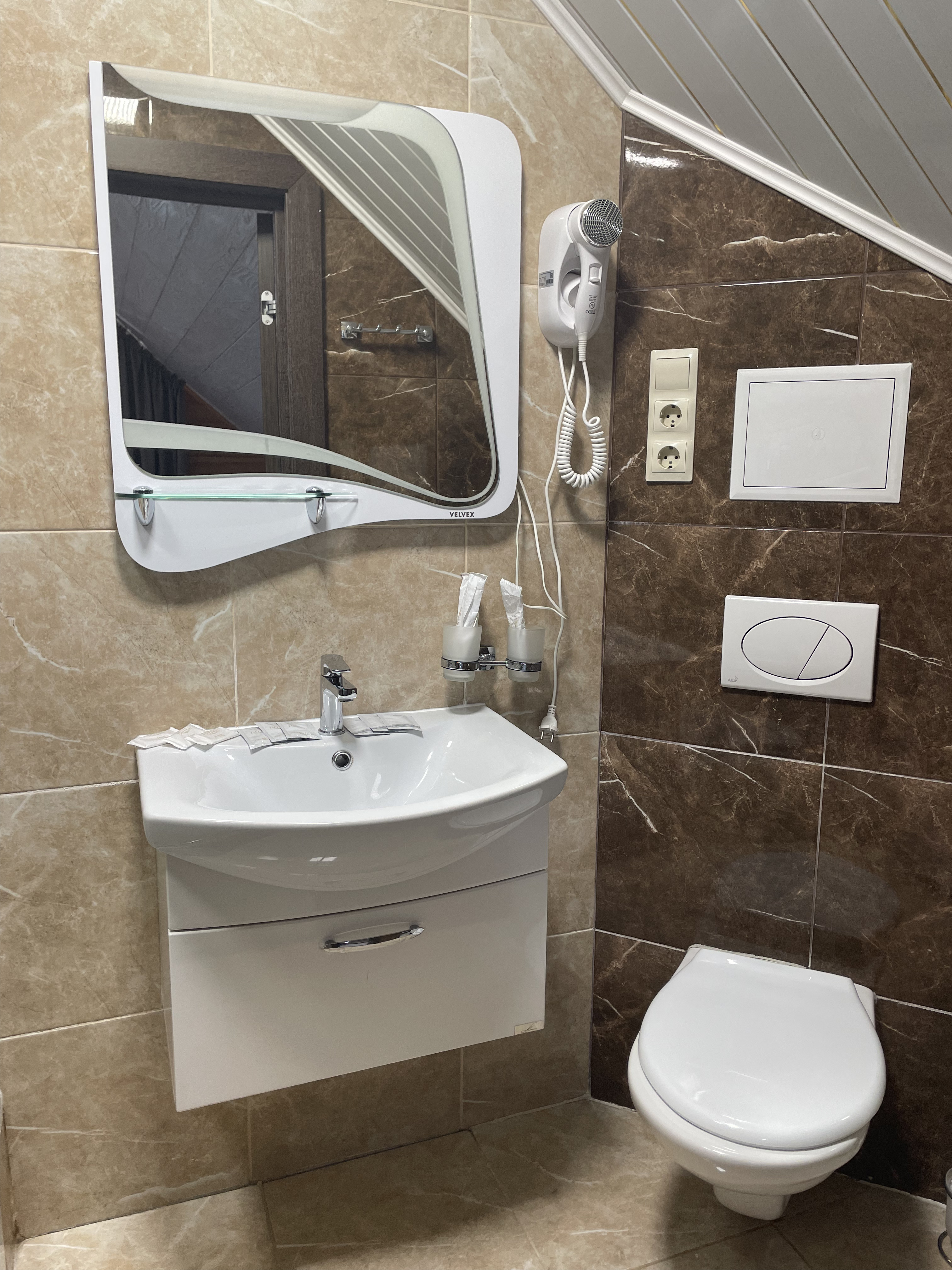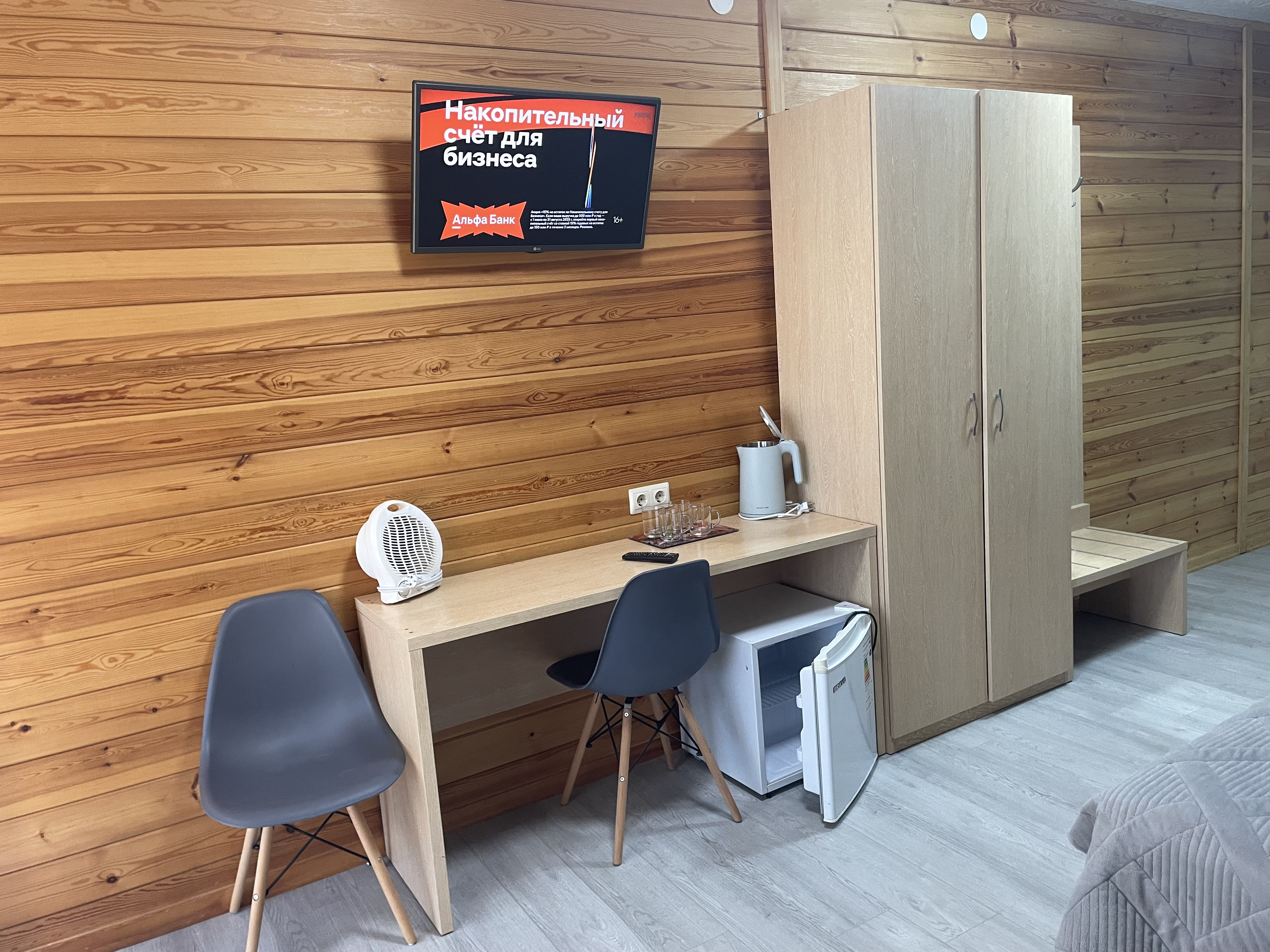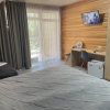 Номер расположен на втором этаже 2-х этажного коттеджа и имеет просторный балкон и свой отдельный вход. Внутренняя отделка выполнена из натурального дерева. В номере имеется 2-е односпальные кровати, раздвижной диван на два доп места, две тумбочки, стол, два стула, шифоньер, прихожая, чайник, кружки, телевизор, холодильник, санузел с душевой кабиной, фен, халаты, полотенца, туалетные принадлежности. Общая площадь номера 24 кв. м. (с балконом 30 кв.м.)