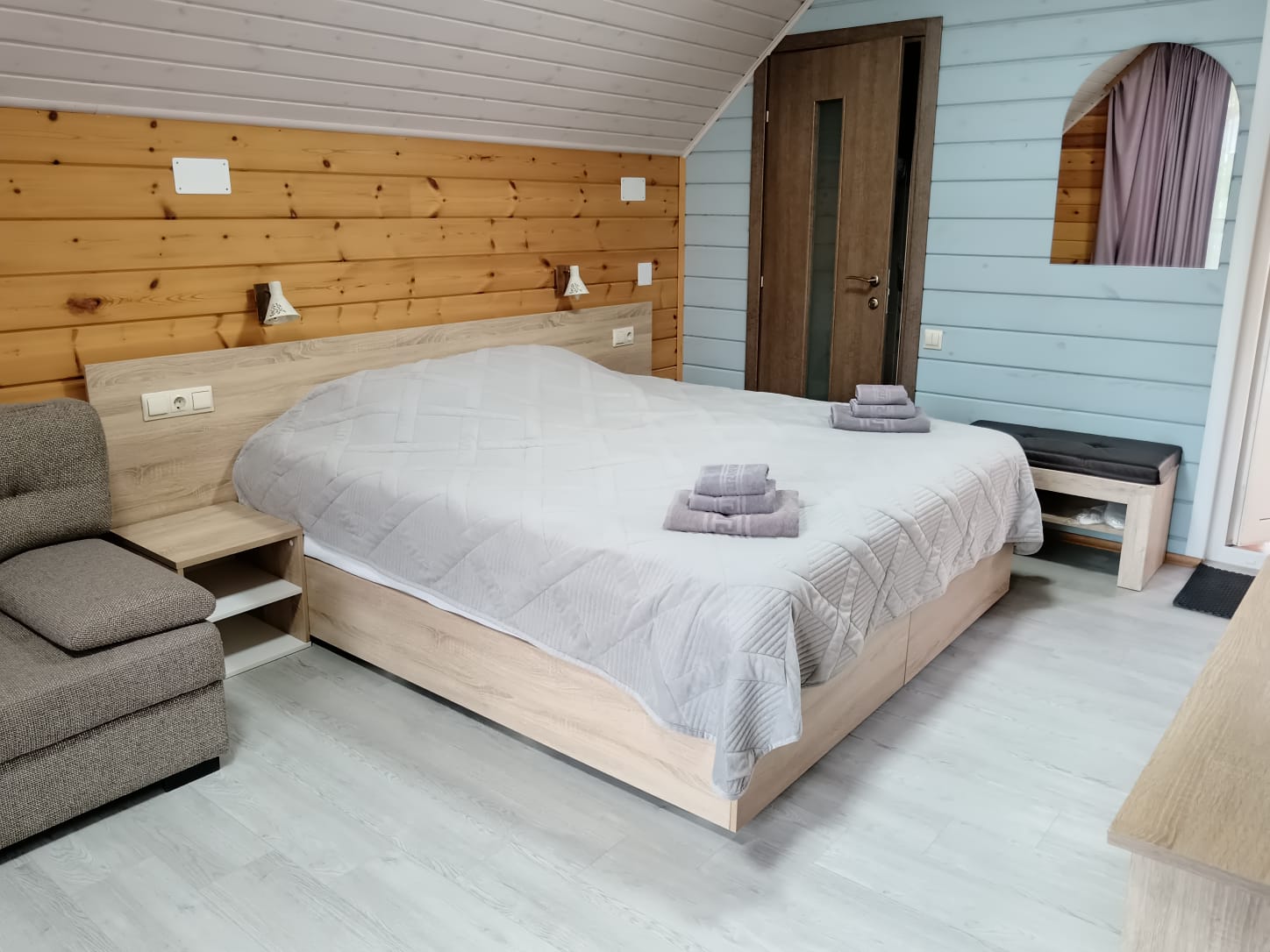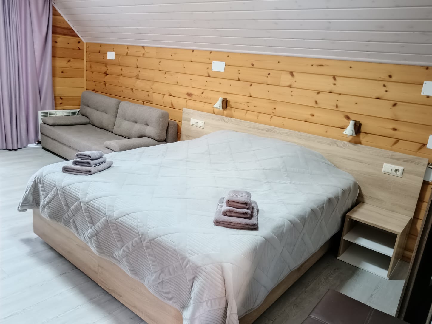 Номер на втором этаже в деревянном коттедже, построенном из экологически чистых материалов. Отдельный вход, лоджия, большое "в пол" окно. Кровать "трансформер", раздвижной диван на два доп места, кондиционер, две тумбочки, прихожая, телевизор, чайник, кружки, фен, с/у с душевой кабинкой, халаты, полотенца, туалетный принадлежности. Общая площадь 25 кв.м. (плюс лоджия 5,5 кв.м.)