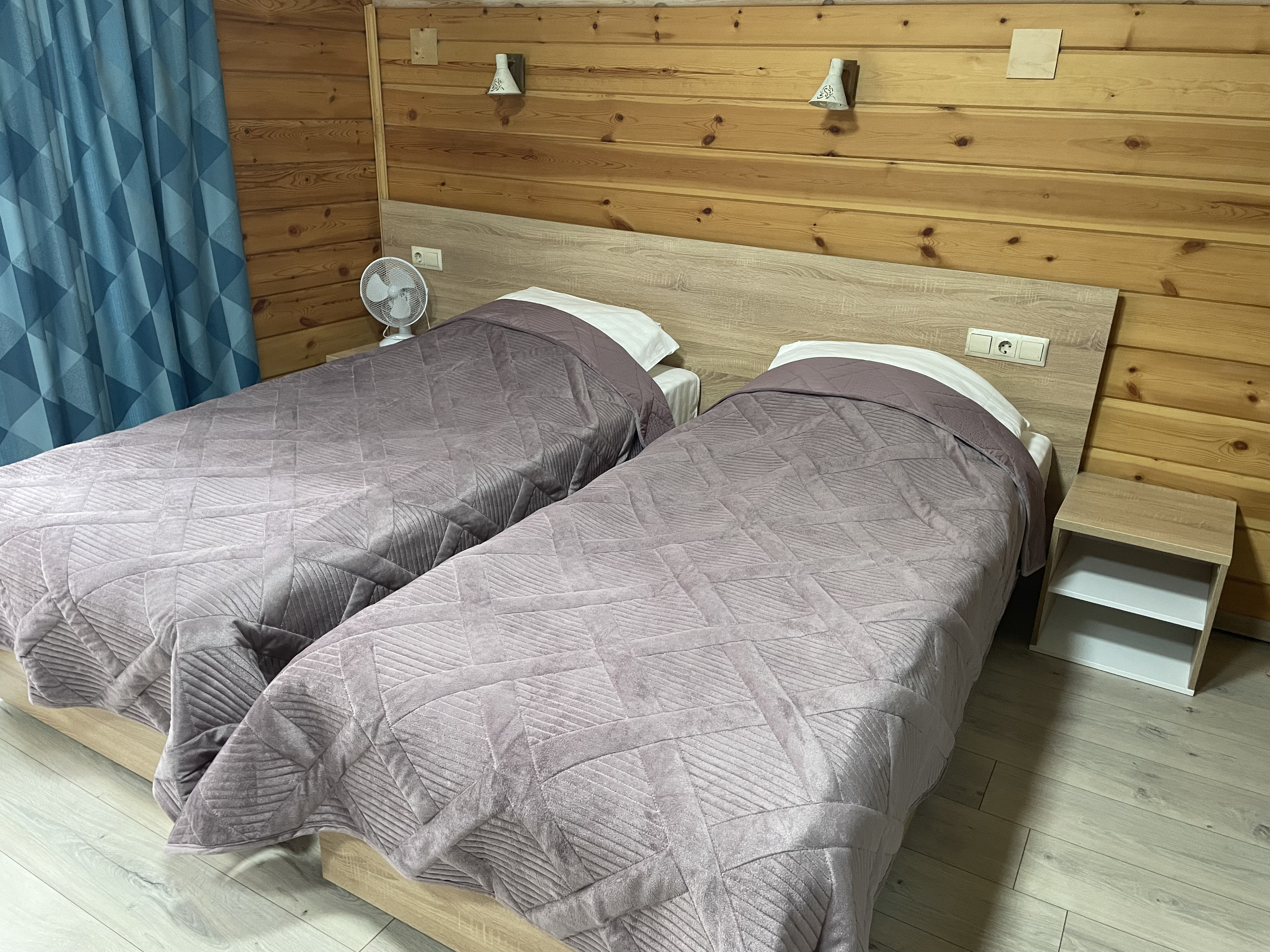 Номер на третьем этаже коттеджа, расположенного на берегу Катуни. Отделка из дерева, большое "окно в пол". Большая 2-х спальная кровать либо две односпальные (кровать трансформер), раздвижной диван на два доп места, две тумбочки, журнальный столик, шифоньер, прихожая, телевизор, холодильник, чайник, кружки, фен, халаты, полотенца, санузел с душевой кабиной и туалетными принадлежностями. Имеется выход на балкон. Общая площадь 24 кв.м.
