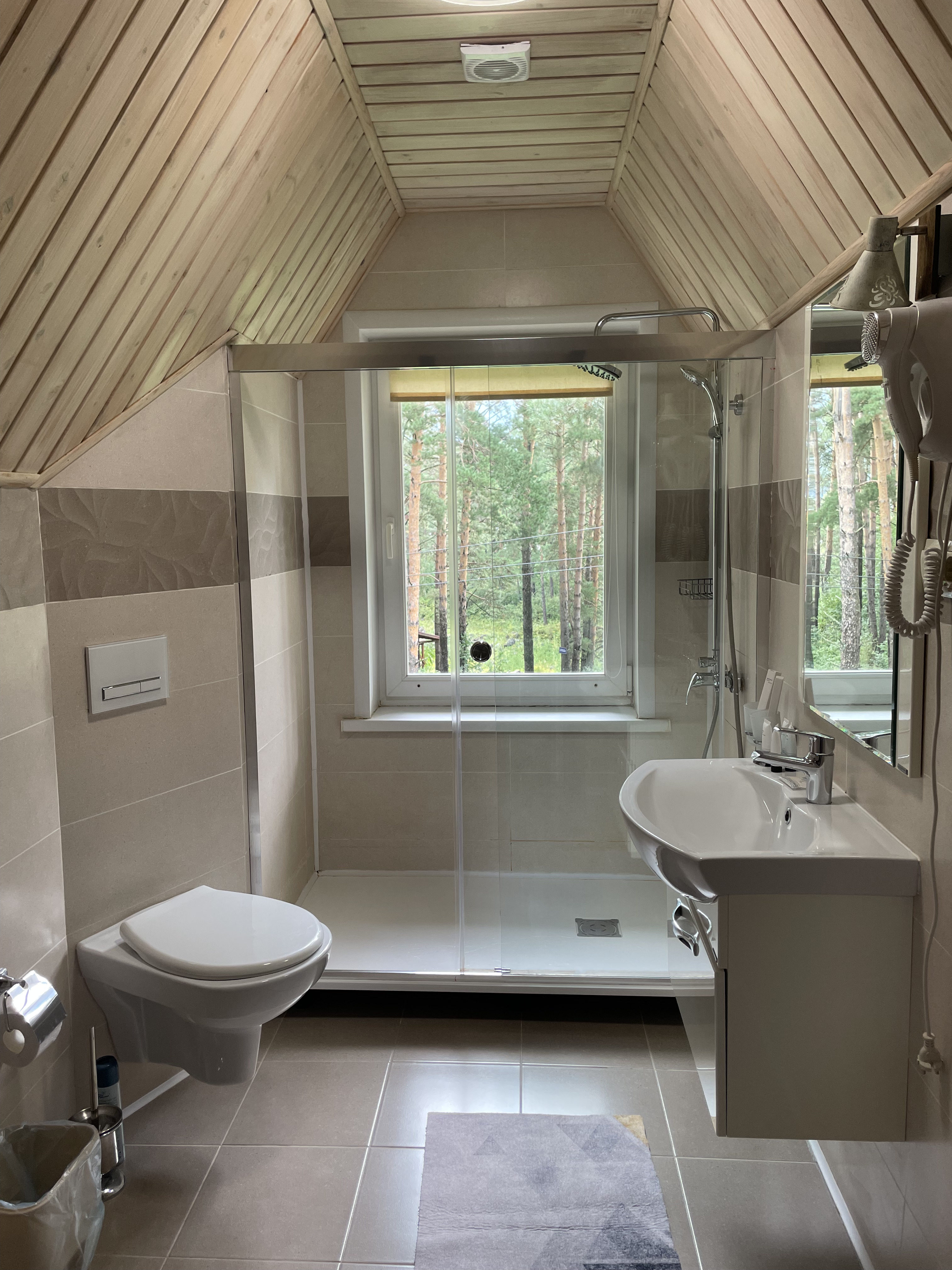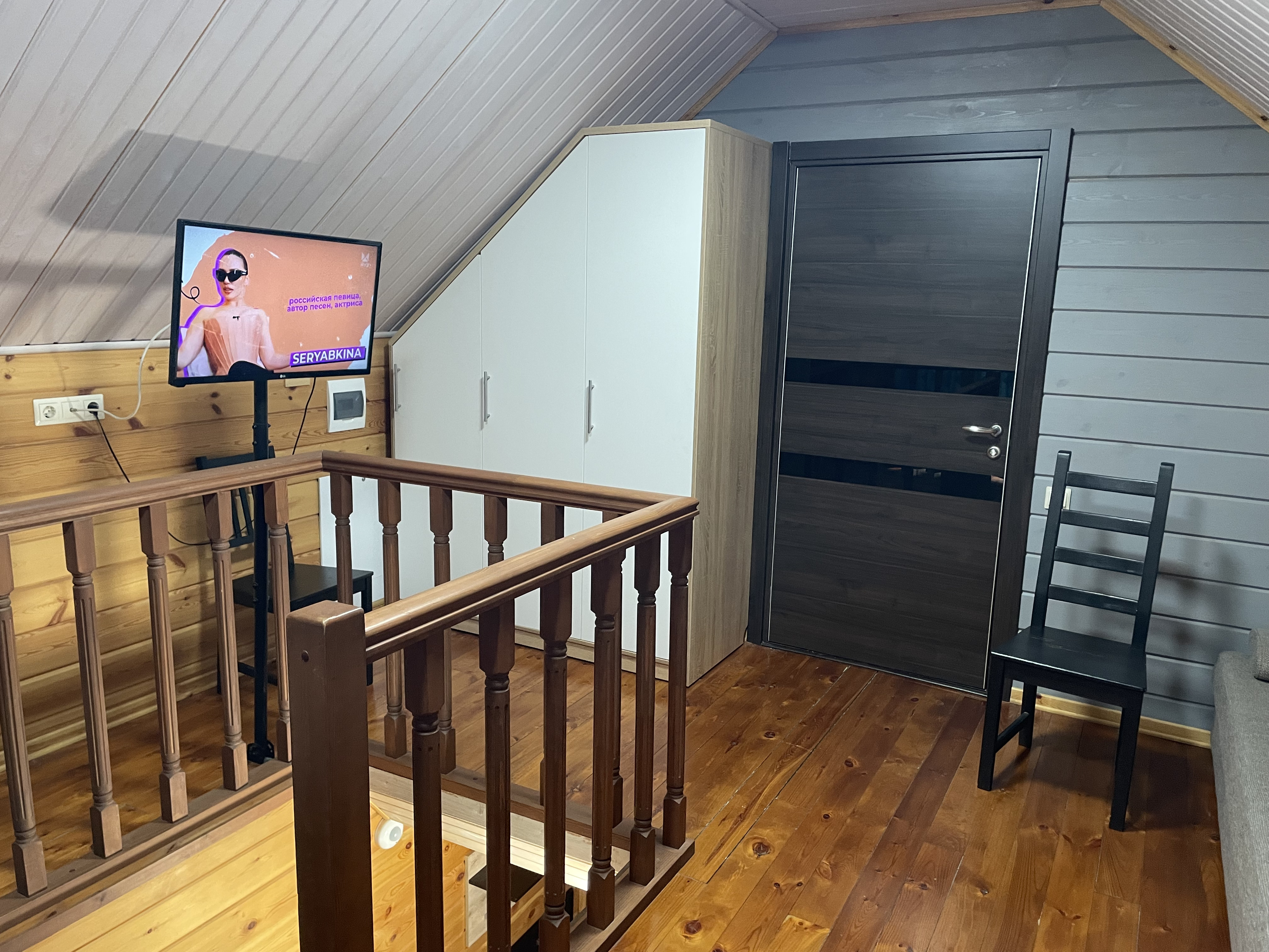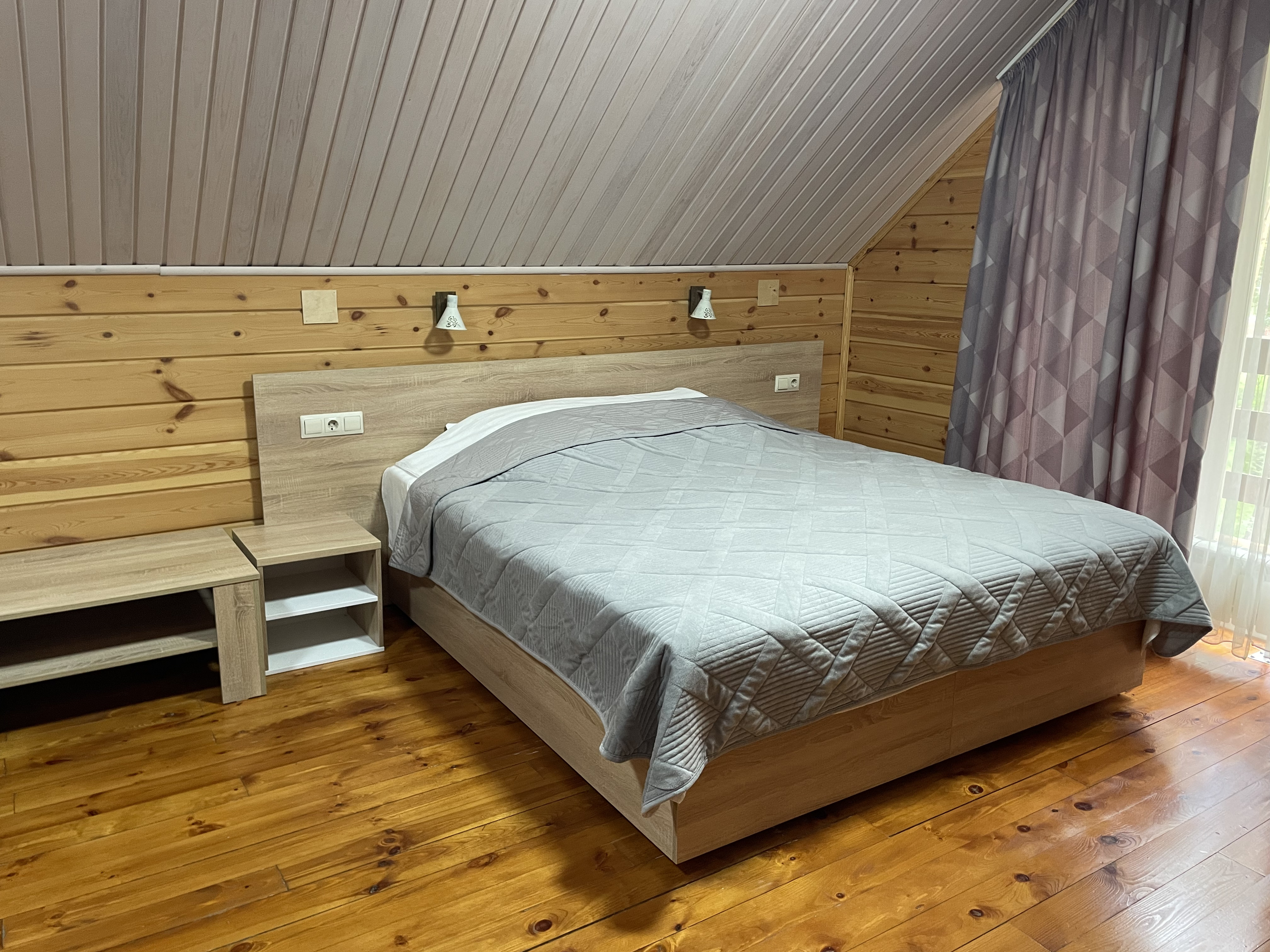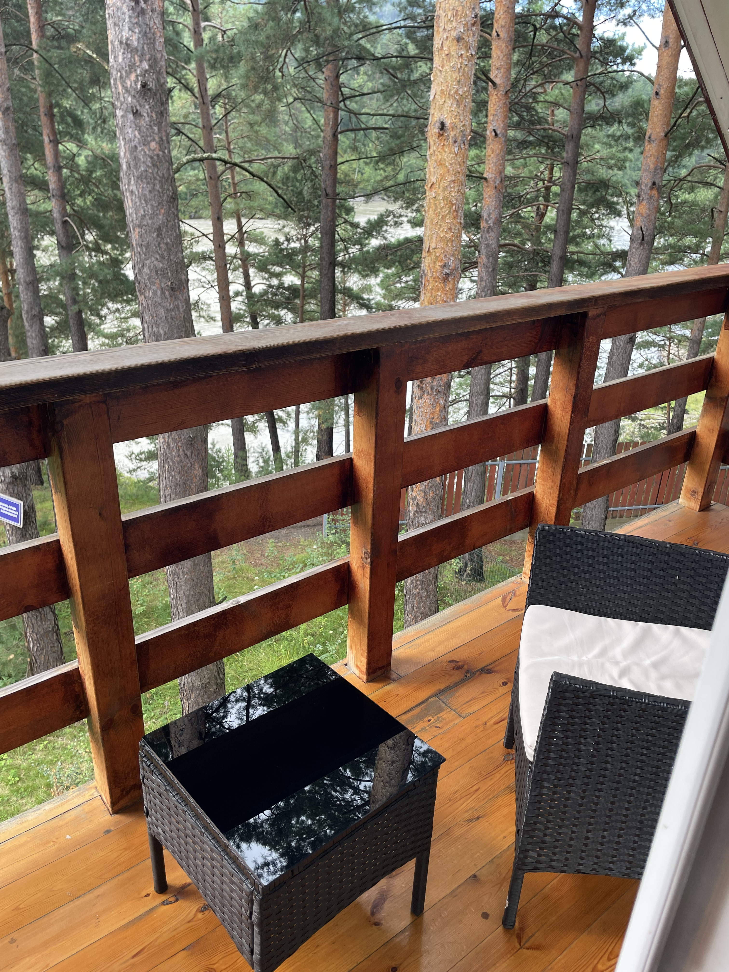 Номер на третьем этаже коттеджа, расположенного на берегу Катуни. Две комнаты, отделка из дерева, большое "окно в пол". Большая 2-х спальная кровать либо две односпальные (кровать трансформер), две тумбочки, раздвижной диван на два доп. места в каждой комнате, журнальный столик, прихожая, телевизор, холодильник, чайник, фен, халаты, полотенца, санузел с душевой кабиной и туалетными принадлежностями. Имеется выход на балкон из каждой комнаты с видом на Катунь и пруд, Общая площадь номера 57 кв.м.